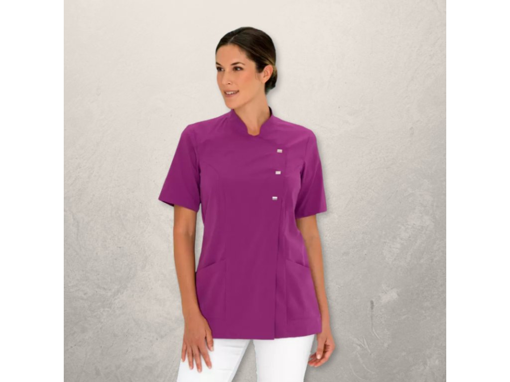 Blúza Greta má krátke rukávy a úzky strih, ktorý dobre padne profesionálom všetkých veľkostí. Mandarínsky golier s asymetrickým, geometricky strihaným skrytým zapínaním dodáva odevu nádych originality a elegancie, ktorý je umocnený tromi odhalenými patentnými gombíkami, ktoré postave dodávajú tú správnu dávku ľahkosti a ženskosti. Má tiež dve bočné vrecká a dva zadné panely, ktoré dodávajú telu pôvab a tvar a dotvárajú dizajn.