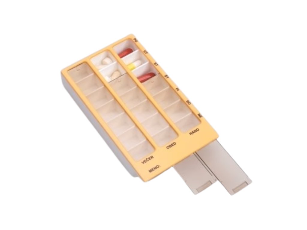 Týždenný dávkovač liekov so 7 priehradkami pre každý deň v týždni. Umožňuje bezpečné, prehľadné a spoľahlivé dávkovanie liekov doma aj na cestách.