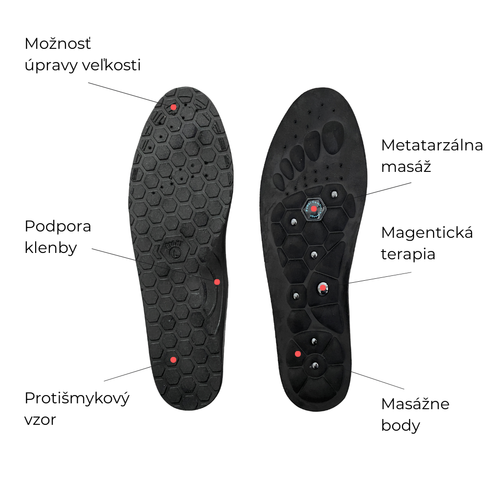 Do vložiek sú integrované malé magnetické komponenty, ktoré dopĺňajú ich viacbodový masážny dizajn a stimulujú reflexné zóny na chodidlách a pozitívne vplývajú na zdravie a celkový pocit pohody. Spolu s tlakovými zónami vytvárajú zaujímavý funkčný prvok vložky a podporujú komfort.