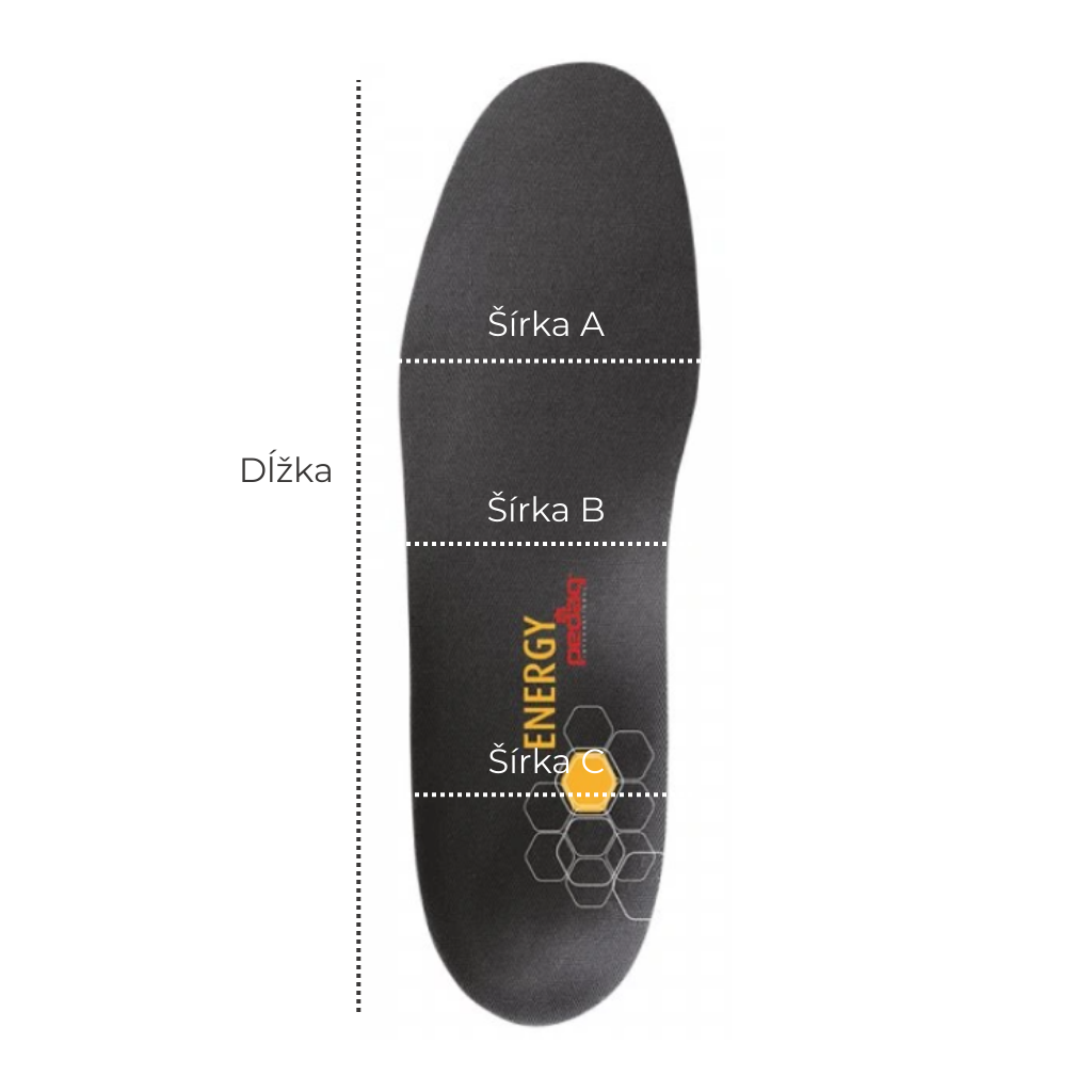 Vyberajte radšej menšiu veľkosť než je číslo vašej obuvi (napr. pri veľkosti 40 zvoľte 38/39). Pôvodnú vložku v topánke odporúčame vybrať a nahradiť ju vložkou pedag Energy.